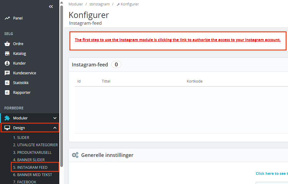 NB!! Viktig at du sier fra til Support. Vi må sette opp en cronjob som laster nye bilder kontunerlig. Hvis dette ikke blir gjort vil Instagram bare vise hvit felter i nettbutikken når du har lagt ut mange nye bilder på Instagram.