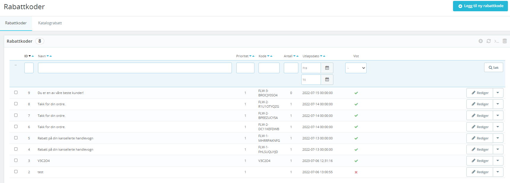 Den første siden viser en oversikt over alle rabatter som finnes i nettbutikken i dag. Her kan du enkelt se hvor mange som er tilgjengelig og når de utløper.